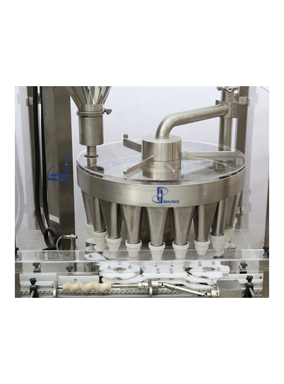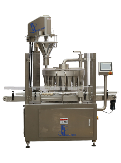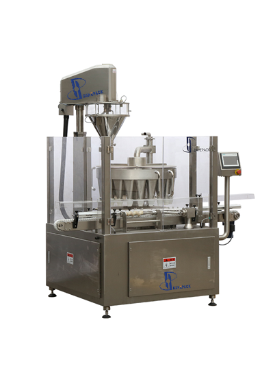 旋轉(zhuǎn)式充填機具有很高的生產(chǎn)效率和生產(chǎn)速度,即使在非??量痰纳a(chǎn)要求下,旋轉(zhuǎn)式充填系統(tǒng)將物料連續(xù)的分發(fā)到旋轉(zhuǎn)的多工位漏斗里,瓶子在漏斗下,一個瓶子對應一個漏斗,不等距螺旋和星形轉(zhuǎn)盤將瓶子均勻的對應到每一個漏斗下同步旋轉(zhuǎn)并振動,螺桿計量機精確的將物料充填到漏斗里,然后物料在星形轉(zhuǎn)盤旋轉(zhuǎn)四分之三圈的時間內(nèi)從漏斗落到瓶子里,特別適用于瓶子口徑小,但包裝速度要求高的各種粉末和小顆粒物料。