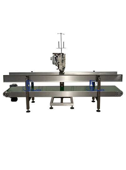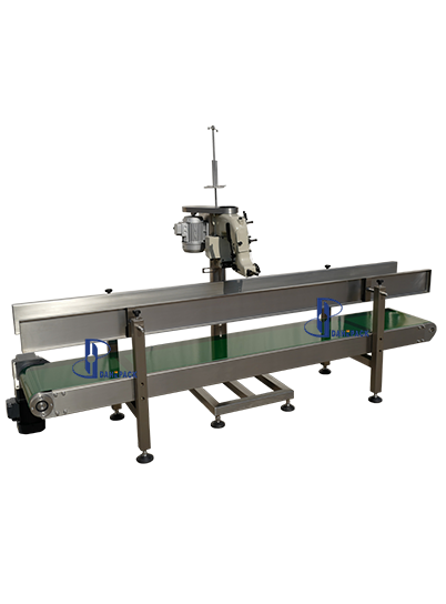 工作方式:裝縫包機裝配在輸送機上;開啟電源后輸送機開始運轉,向前輸送裝滿物料的袋子,當袋子到達縫包機壓腳處,接近開關感應到袋子自動啟動縫包機,運行到設定的時間達到時自動停止,縫好每一袋時手推袋角切刀剪切線辮。